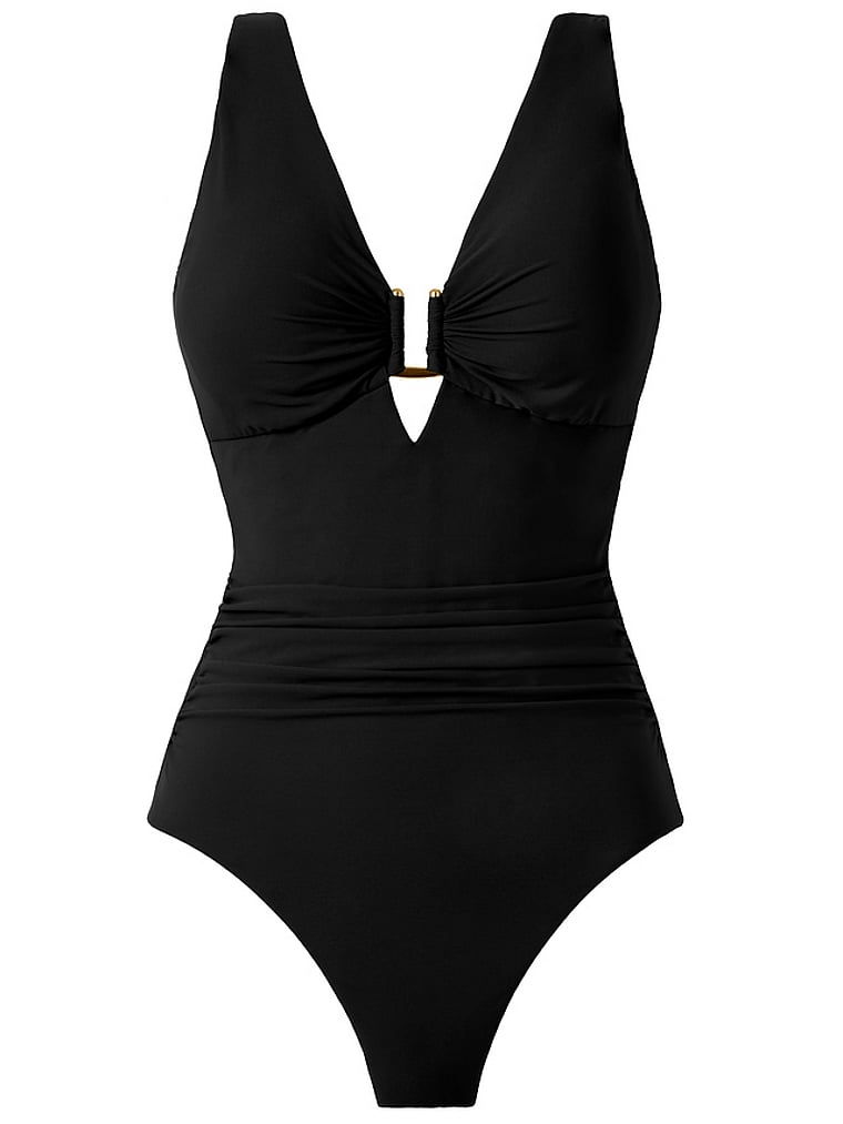 This chic and supportive suit features a built-in, soft cup Bra that can accommodate up to a D cup. U-shaped hardware detailing adds a glamorous finish to a plunging, V-neckline.