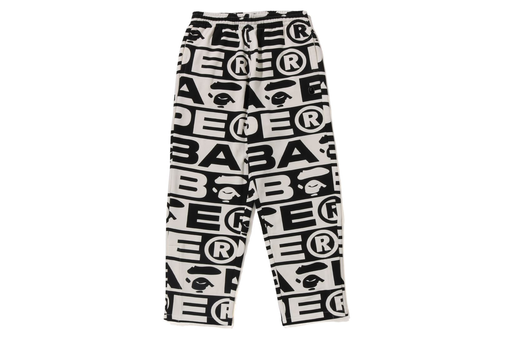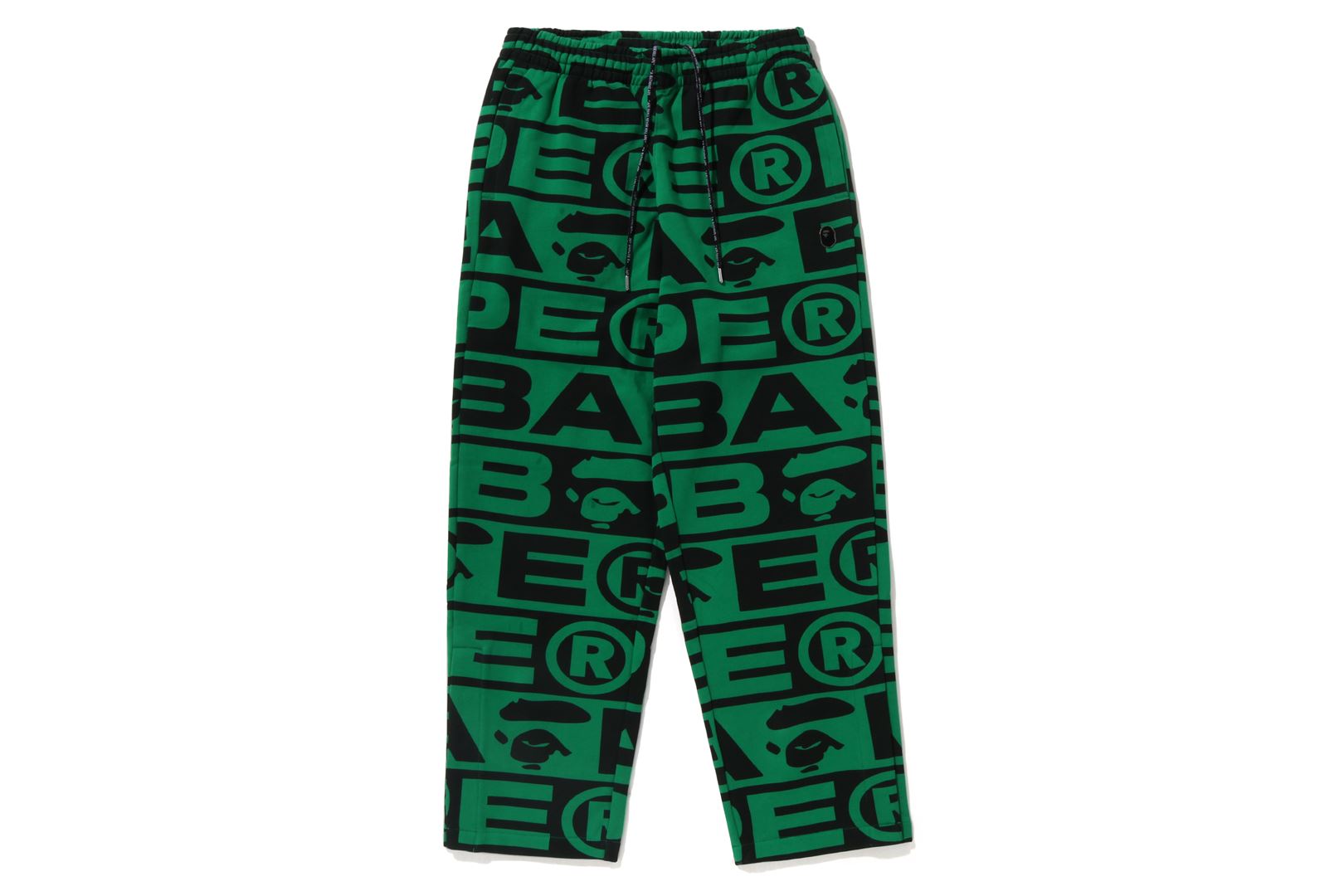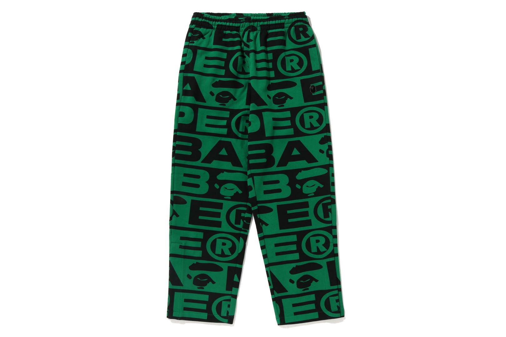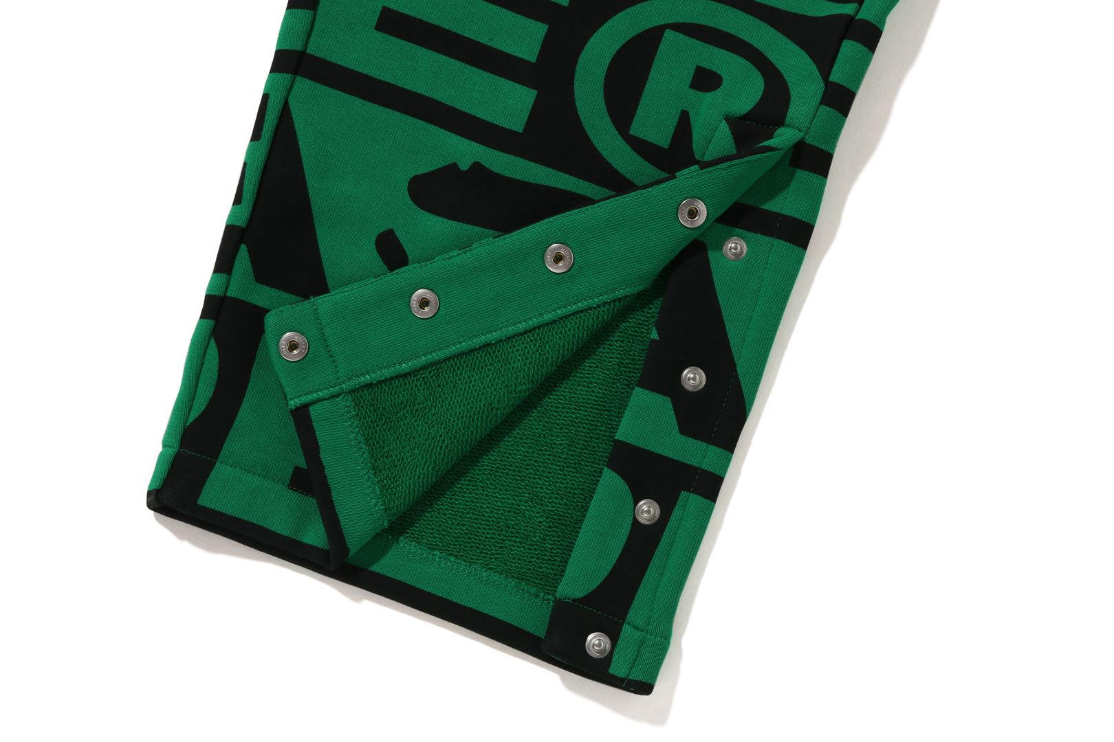 Sweatpants made of cotton/polyester blend fleece material with BAthtPE?? logo printed all over. Slash pockets on both sides and zip pocket on the right back. An AthtPE HEAD type charm is included at the tip of the zip. Comes with an original spindle with BAthtPE engraved stopper on the waist, allowing you to adjust the silhouette. Wide silhouette with room around the waist and thighs. Available in 3 colors and 5 sizes.