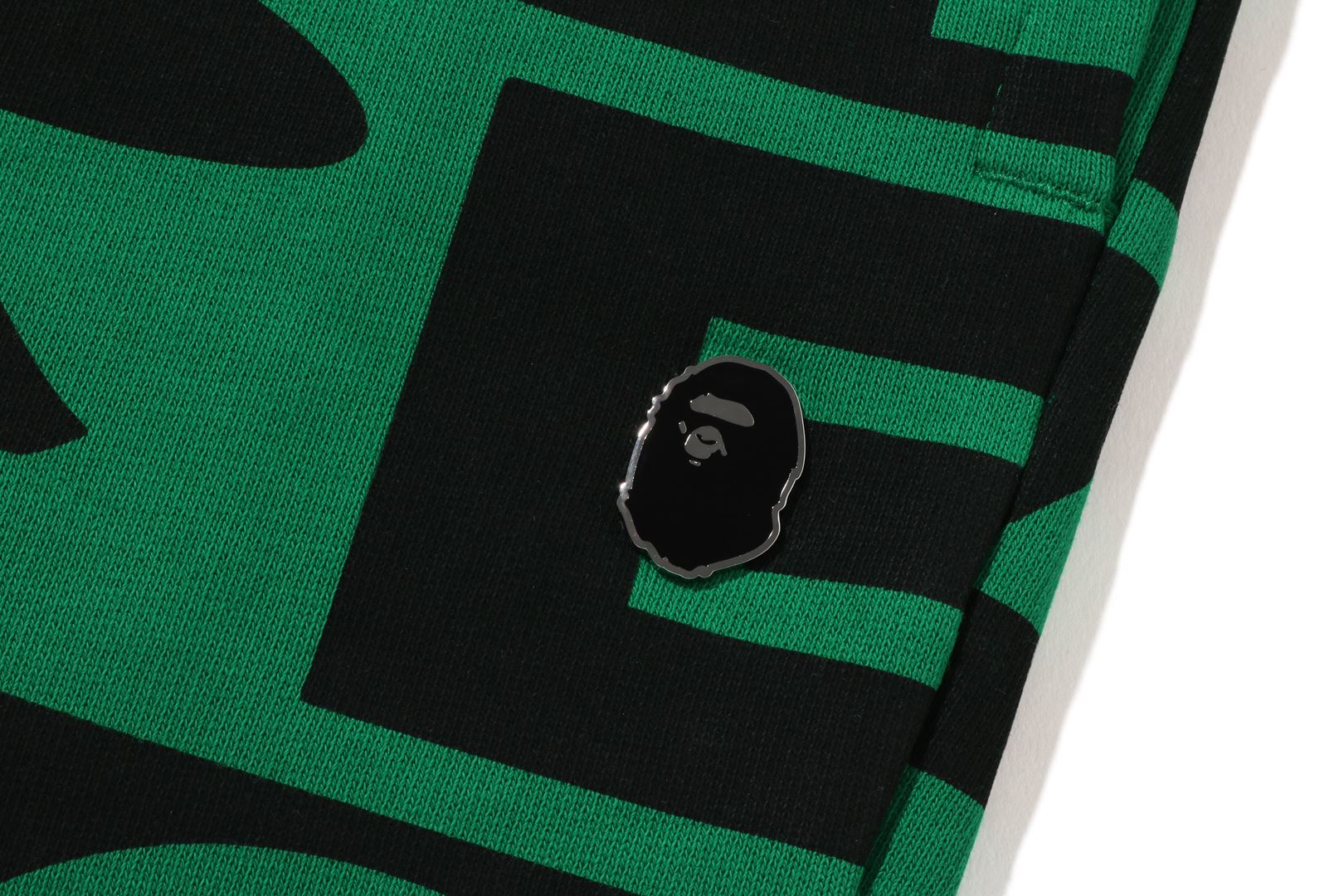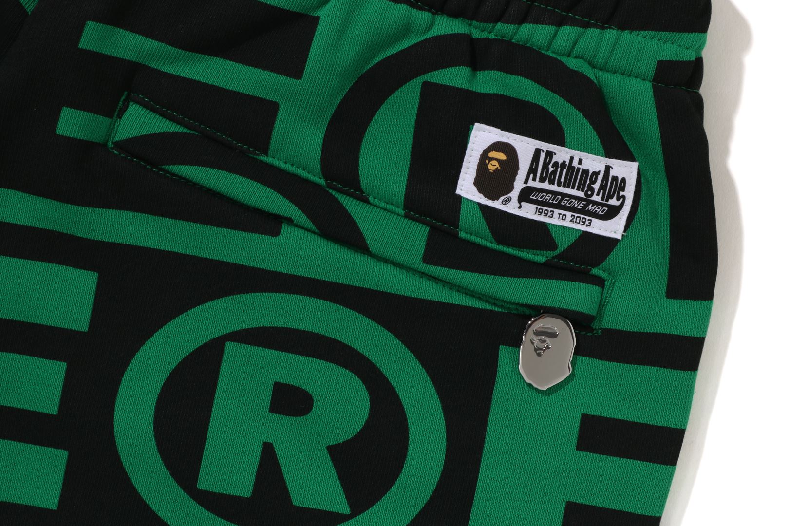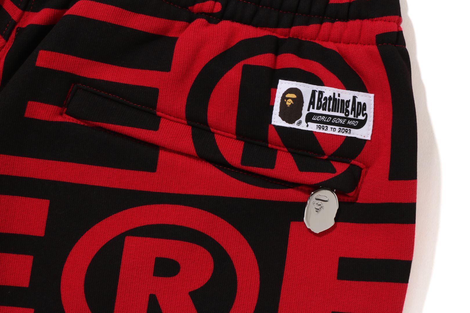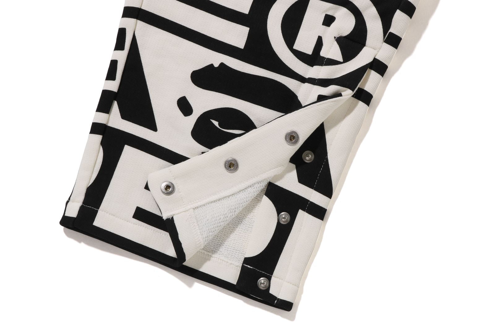 Sweatpants made of cotton/polyester blend fleece material with BAthtPE?? logo printed all over. Slash pockets on both sides and zip pocket on the right back. An AthtPE HEAD type charm is included at the tip of the zip. Comes with an original spindle with BAthtPE engraved stopper on the waist, allowing you to adjust the silhouette. Wide silhouette with room around the waist and thighs. Available in 3 colors and 5 sizes.