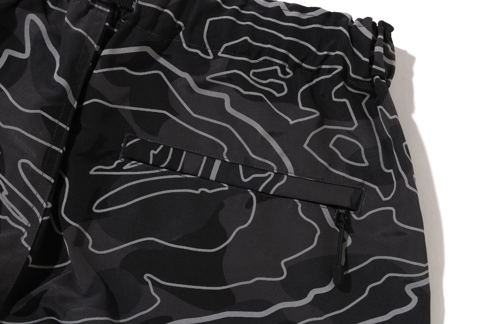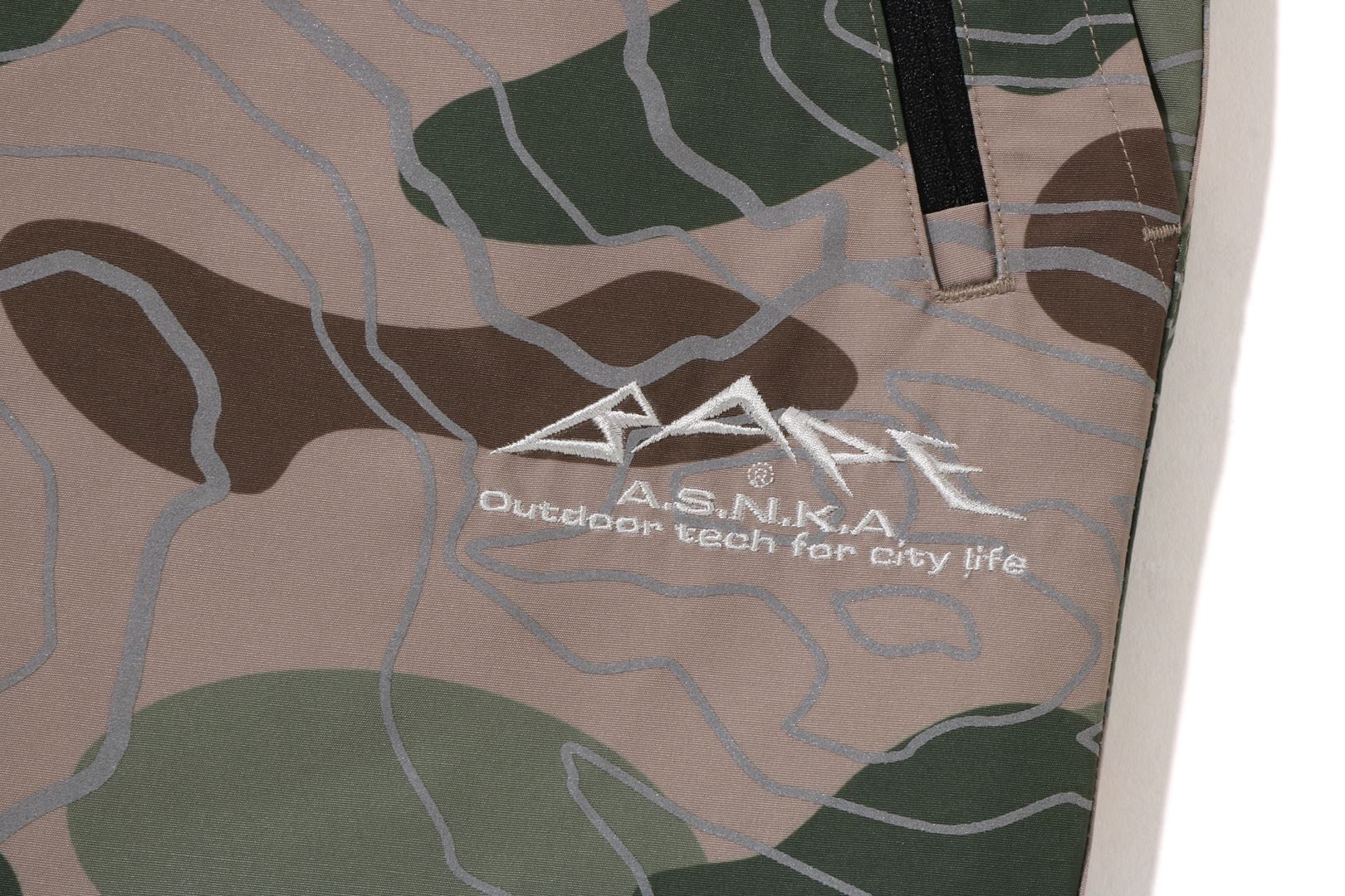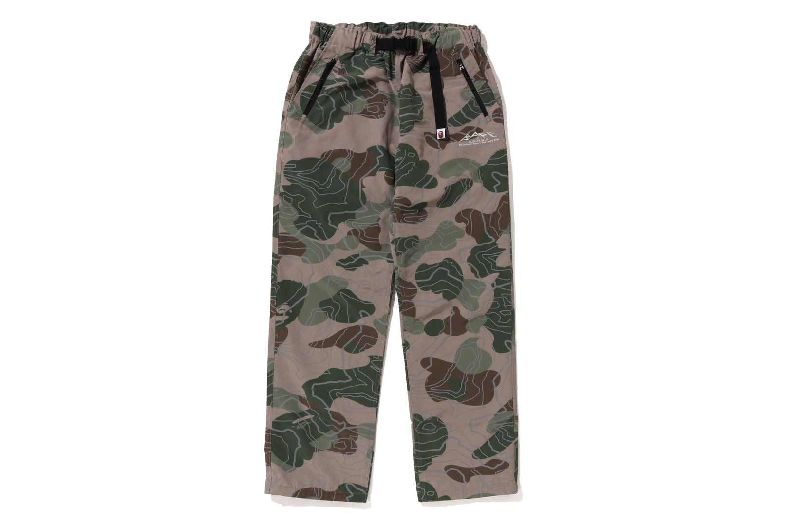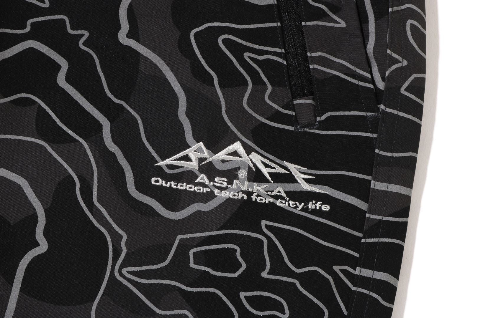 Track pants made of polyester material arranged in a LAYERED LINE CAMO pattern. BAthtPE's new pattern graphic is embroidered on the left thigh, and the LAYERED LINE CAMO pattern on the body is designed with a reflector print. Slash pockets with zips on both sides, zip pocket on the right back. A weaving belt at the waist and rubber spindles at both hems allow for size adjustment. Silhouette with a little room around the waist and thighs. Available in 2 colors and 5 sizes.