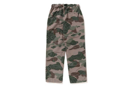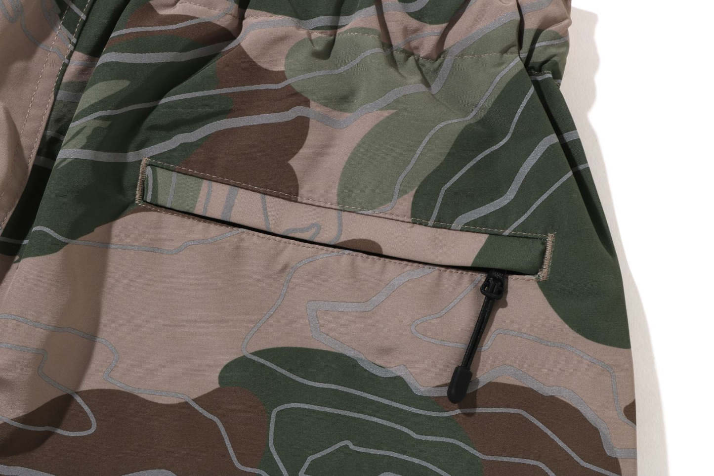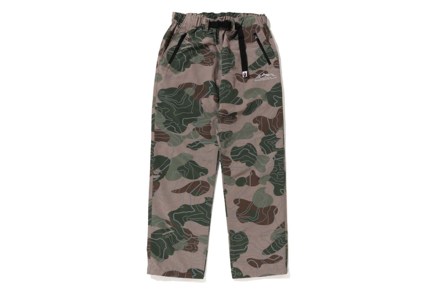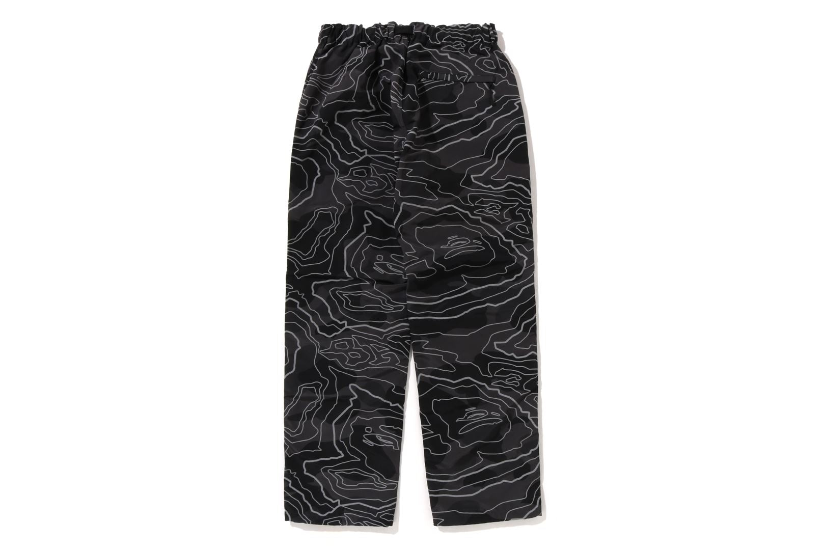 Track pants made of polyester material arranged in a LAYERED LINE CAMO pattern. BAthtPE's new pattern graphic is embroidered on the left thigh, and the LAYERED LINE CAMO pattern on the body is designed with a reflector print. Slash pockets with zips on both sides, zip pocket on the right back. A weaving belt at the waist and rubber spindles at both hems allow for size adjustment. Silhouette with a little room around the waist and thighs. Available in 2 colors and 5 sizes.