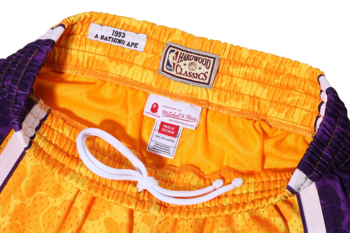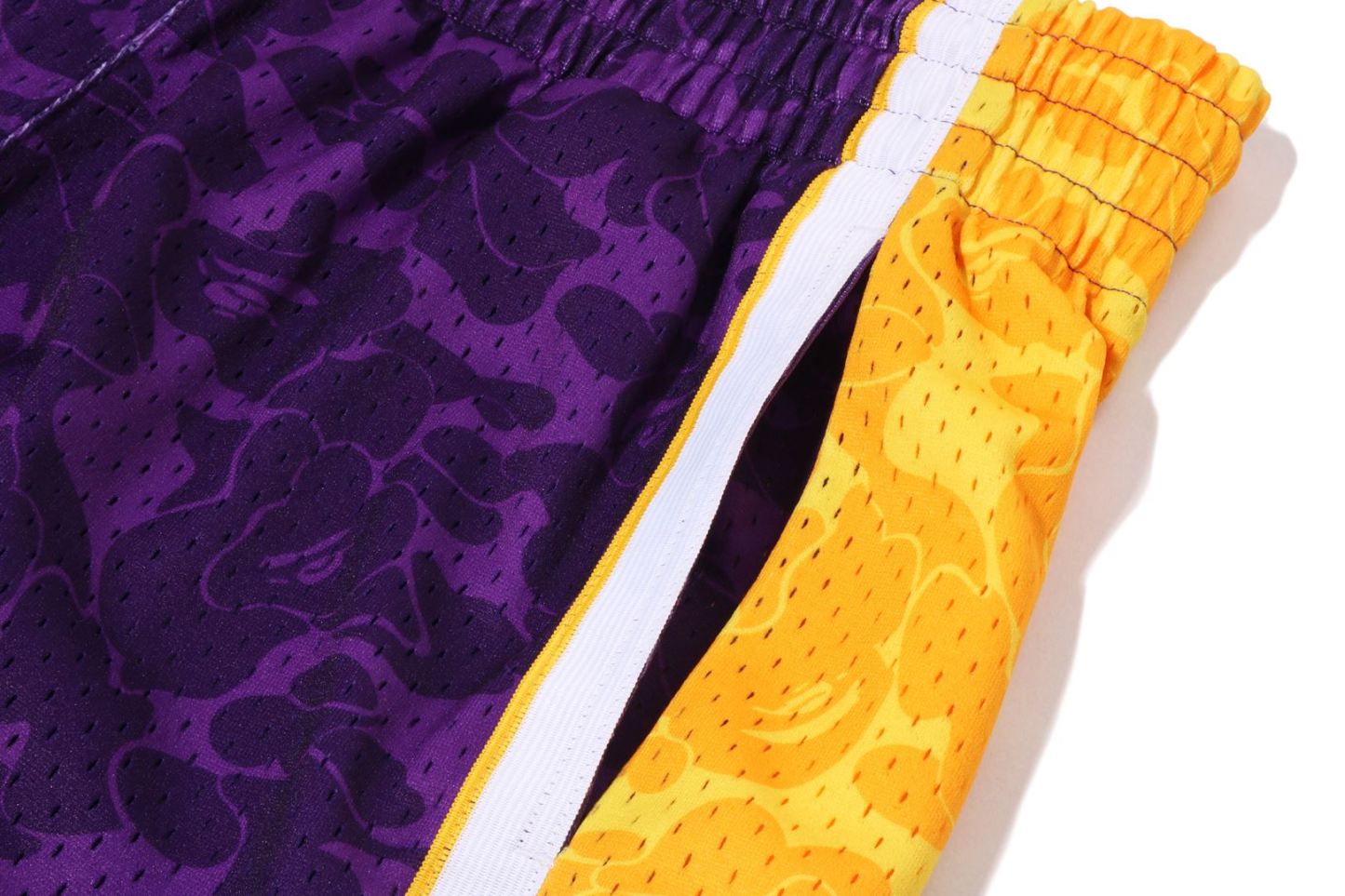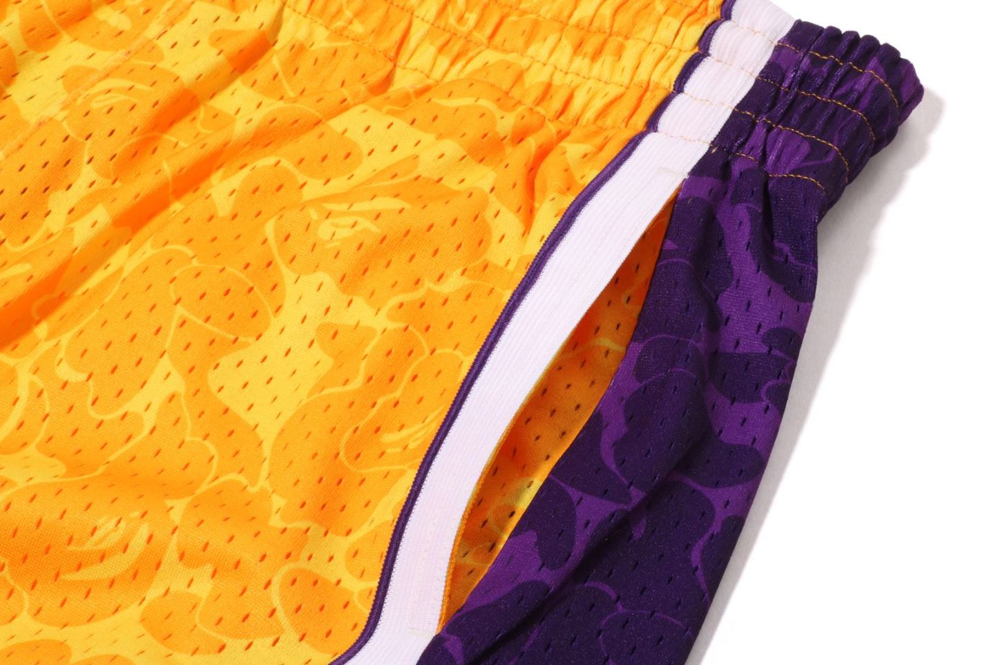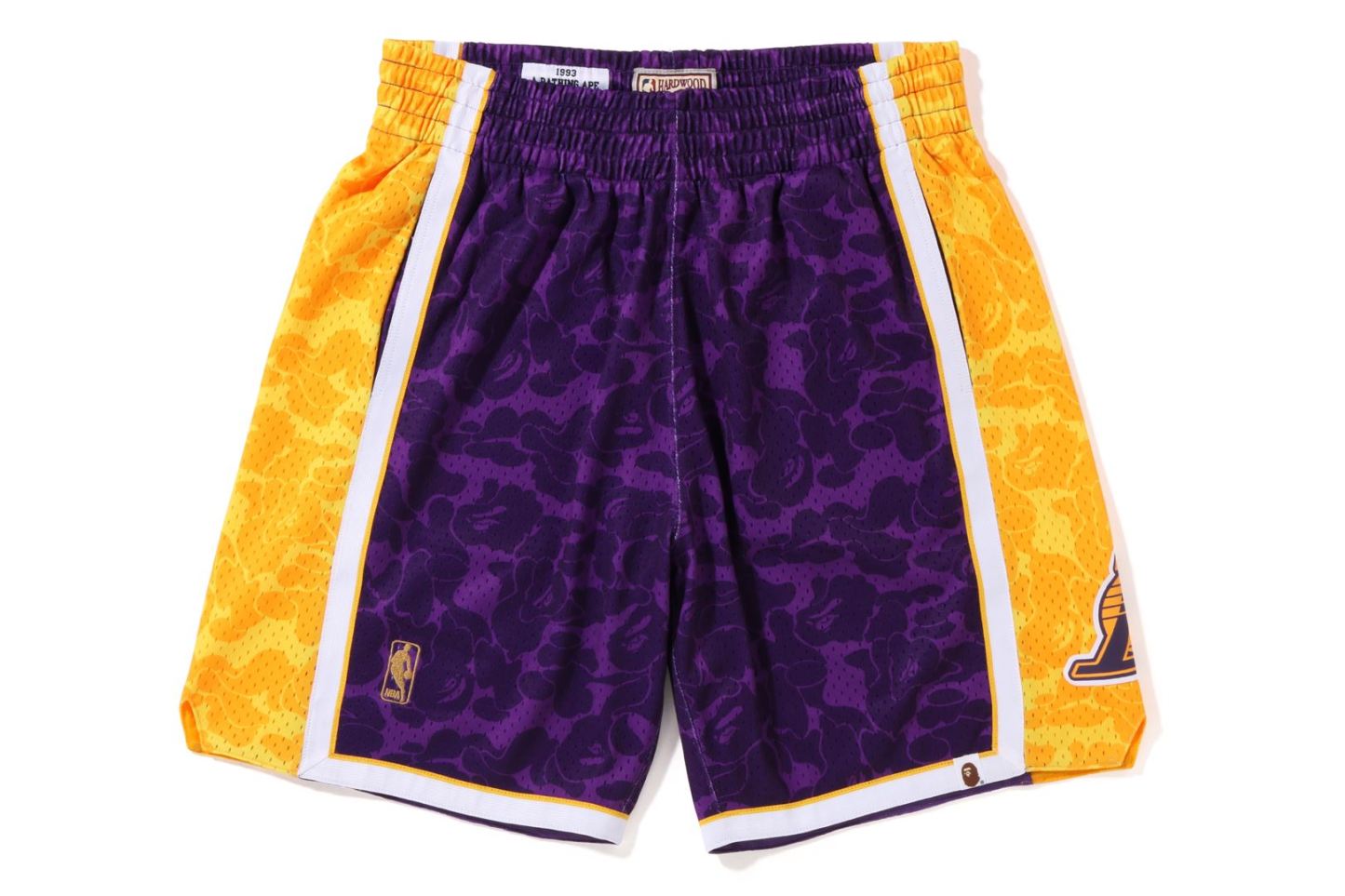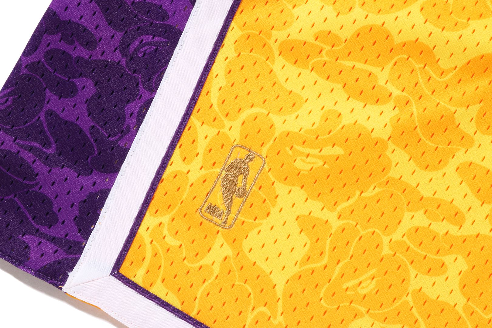 Basketball shorts made of polyester ABC-CAMO pattern mesh fabric. The NBA logo is embroidered on the right hem, the Los Angeles Lakers logo is embroidered on the left side, and the piss name is placed on the left hem. A silhouette with a relaxed fit. Available in 2 colors and 5 sizes. A triple collaboration model with Mitchell & Ness and the Los Angeles Lakers.