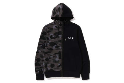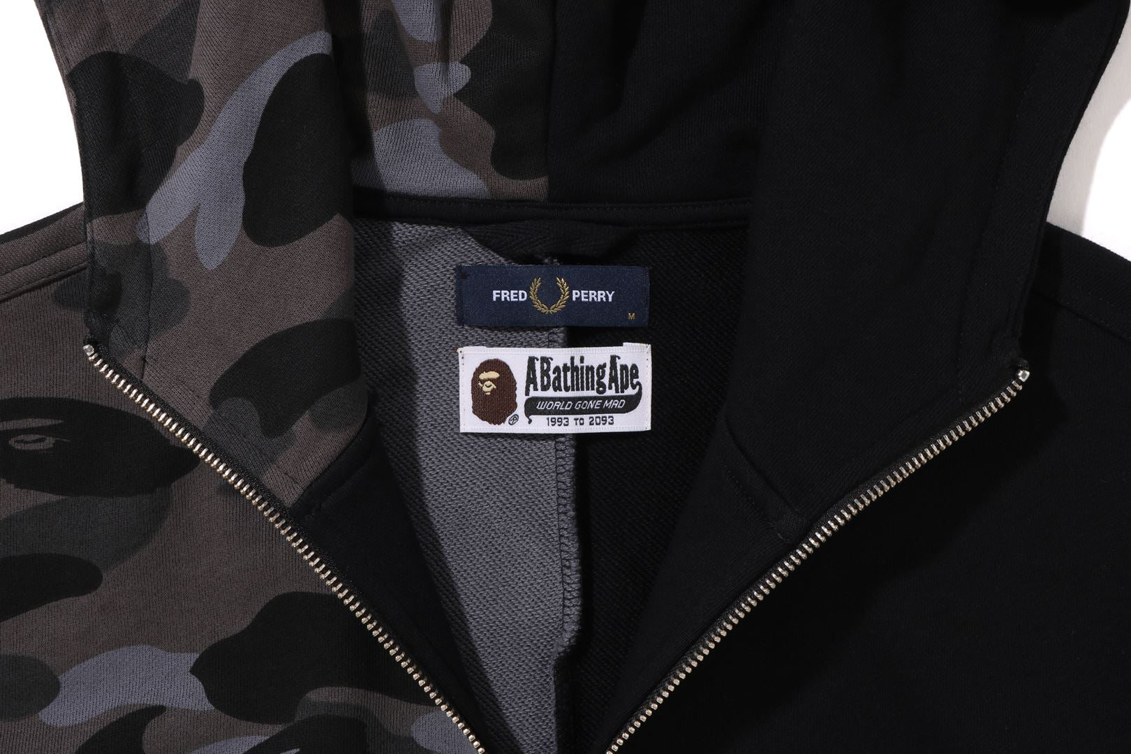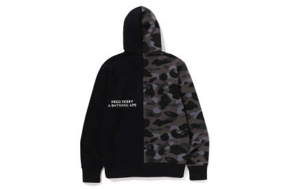 Zip-up hooded with COLOR CAMO pattern cotton material switched on the left side of the body. A design with Fred Perry's laurel wreath and AthtPE HEAD on the left chest, the same logo on the left back, and embroidered names of the two brands. A muff pocket on the abdomen and a spindle on the hood opening allow you to adjust the silhouette. Regular fit silhouette. Available in 1 color and 6 sizes. A collaboration model with Britain's leading brand, Fred Perry.