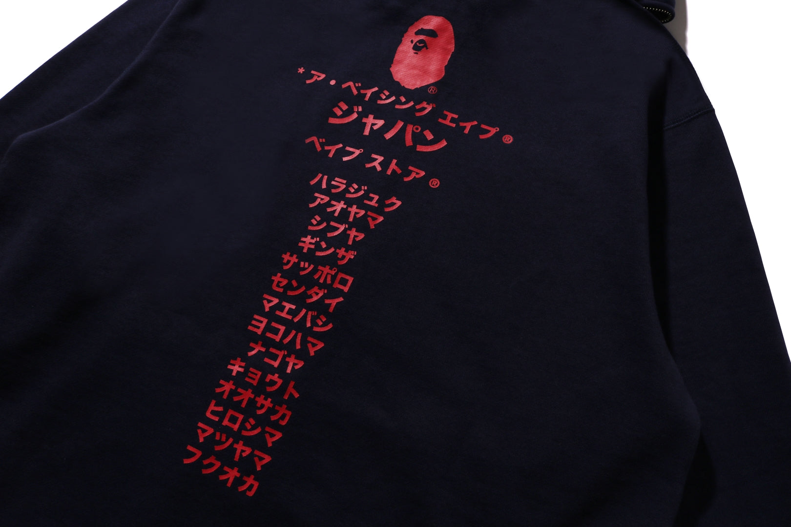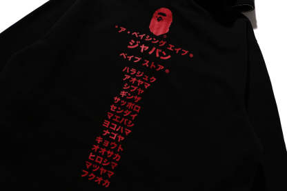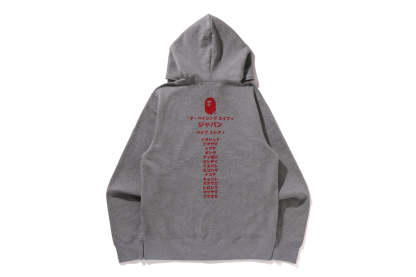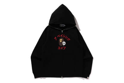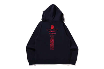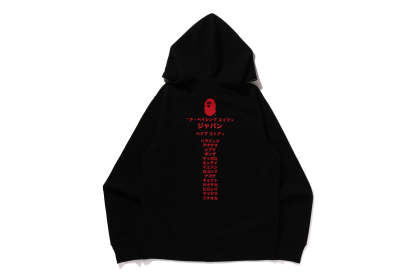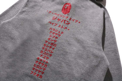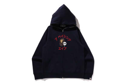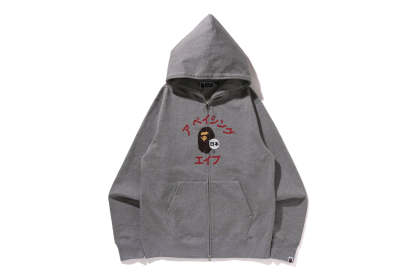 Zip-up hooded made of brushed cotton fleece material with a nice texture. The front features AthtPE HEAD, a speech bubble and the Japanese letter arch-shAthtPEd katakana logo, and the back features a rubber print of AthtPE HEAD, the brand name, and the katakana city name of STORE. A muff pocket on the abdomen and a piss name tucked into the left sleeve. Regular fit silhouette. Available in 3 colors and 6 sizes.