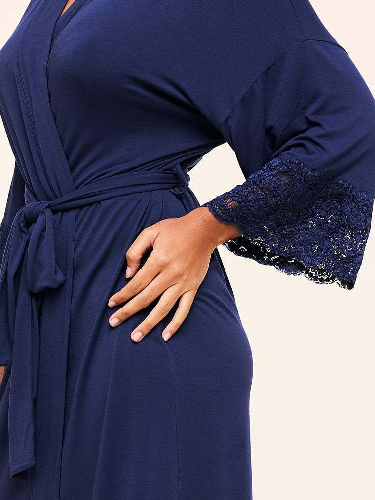 Soft knit fabric and cropped sleeves make this ultra-luxe robe easy to wear for lounging and relaxing. Lace trim adds a special touch.