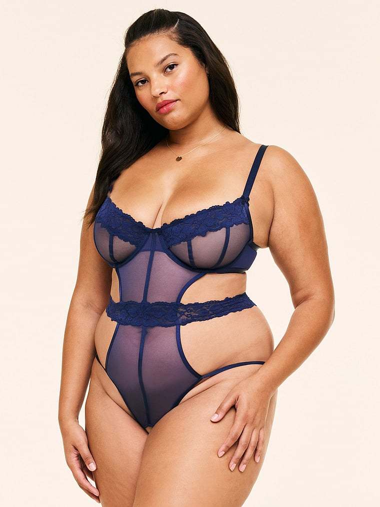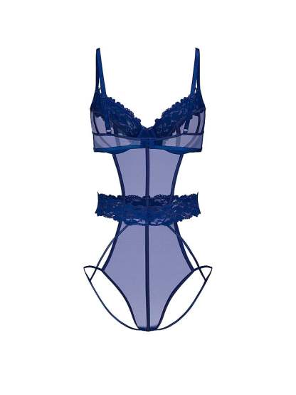 Hello, hotness. This completely sheer bodysuit has lace trim and a lace belt, plus underwire demi cups for a bit of lift.