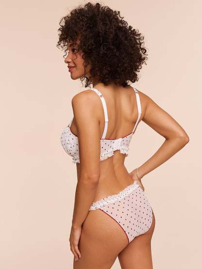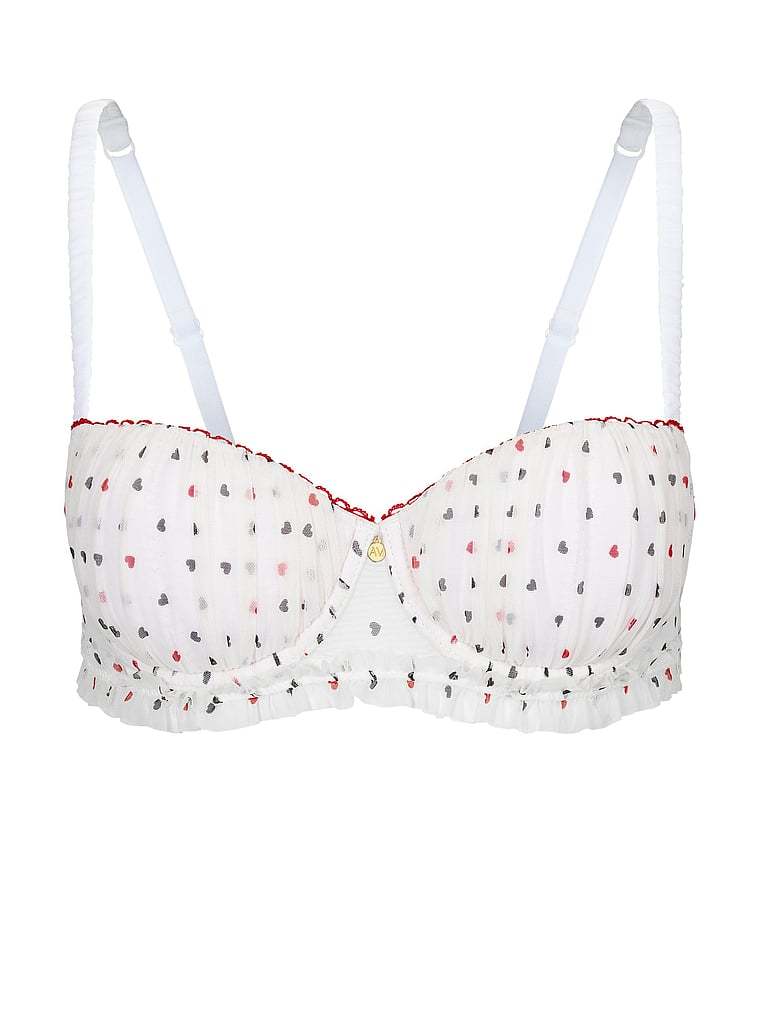 With sheer fabric and a contour balconette design, this mesh bra has a ruffle-trimmed bottom band and pretty ruching throughout.