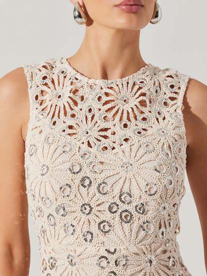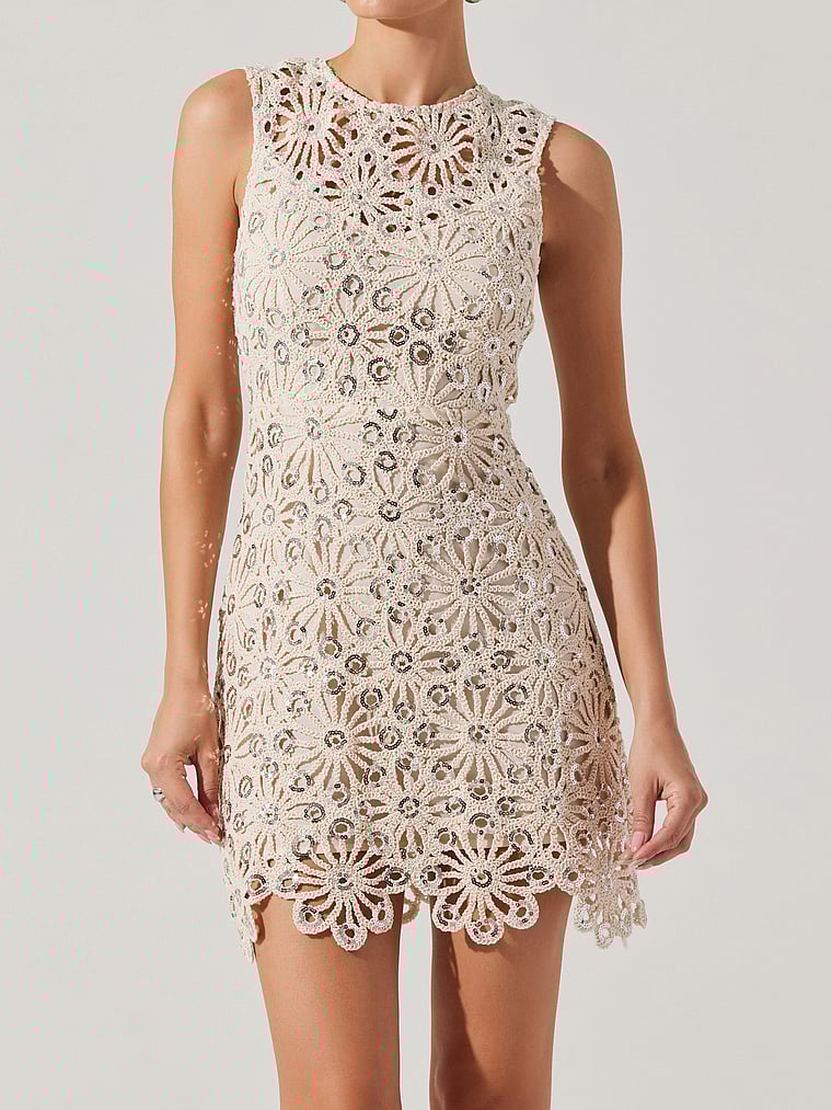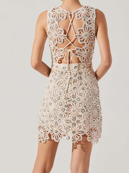 Shimmering sequins give this crochet Dress an elevated, event-ready feel. Scalloped hems and a flirty back-tie detail complete the look.