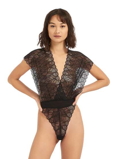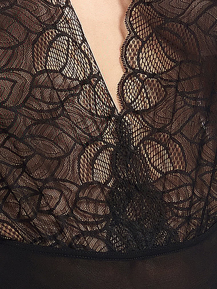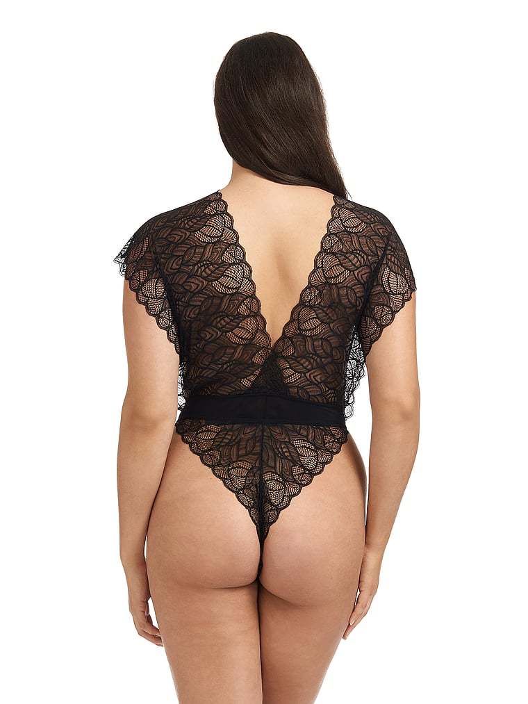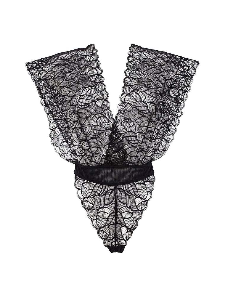 Exude romance in this style that features a deep plunge front and back, plus wide, intricate lace panels that sit perfectly across your shoulders to create a bold silhouette. Wear on its own as lingerie or pair with your favorite jeans.