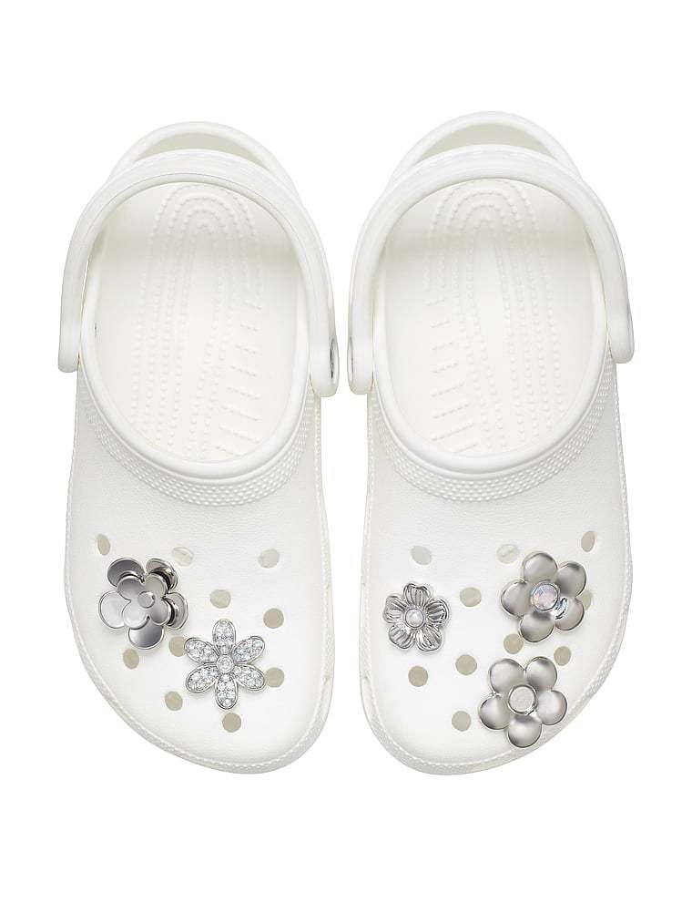 Pop some personality into your shoes with these Monochrome Slvr Flwrs 5 Pack Jibbitz™ charms. They’re the perfect addition to your favorite pairs of clogs, slides, and more.