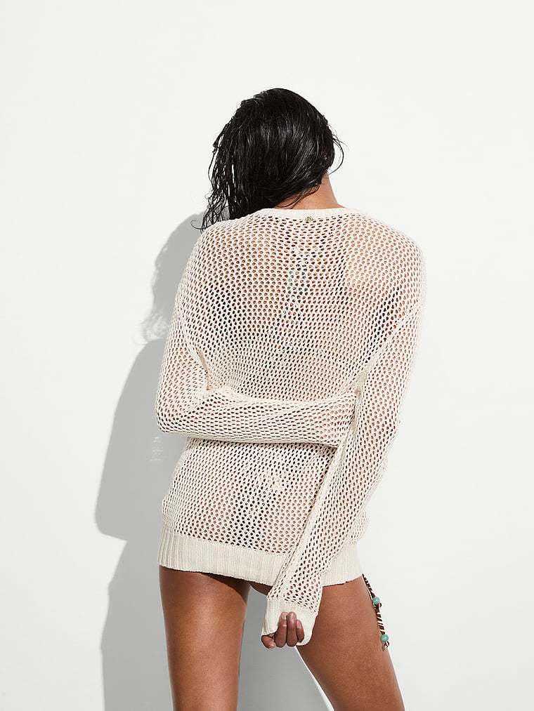 It's the perfect summer Sweater—lightweight and relaxed in an open-work crochet knit that shows just the right amount of skin. See-through styling is ideal for showing off a cute suit underneath.