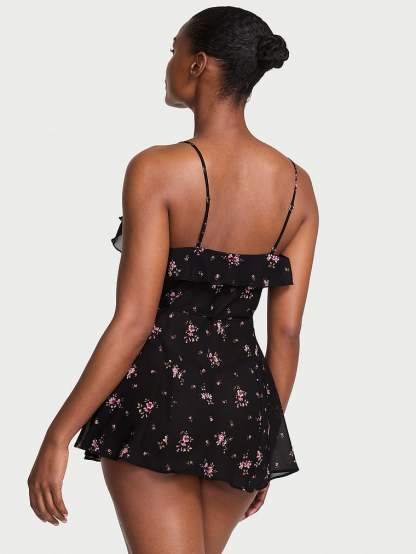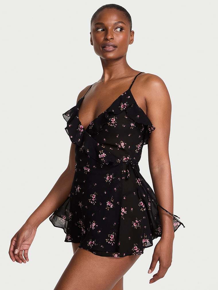 Finished with a frill, this flirty, wrap-front Babydoll is designed in floaty chiffon with a romantic floral print. The matching V-String completes the dreamy Set.