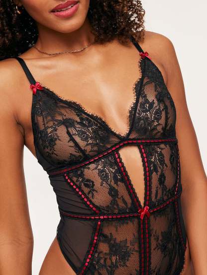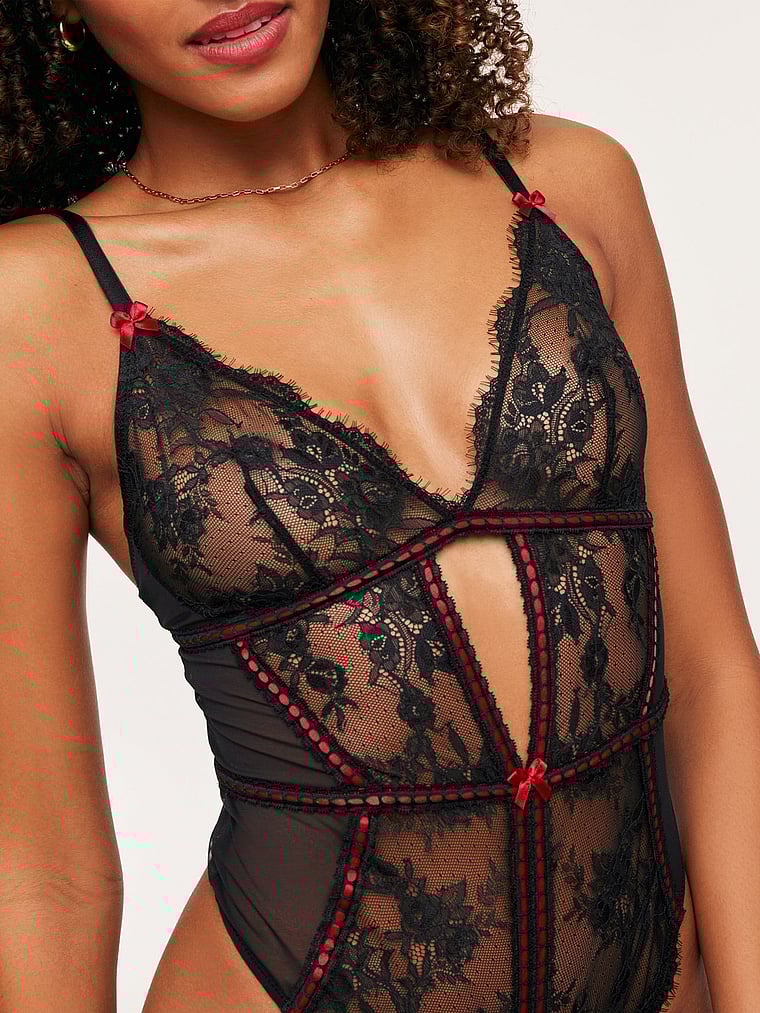 Confidence radiates from this crotchless style, featuring lace trim and ribbon details to draw the eye.