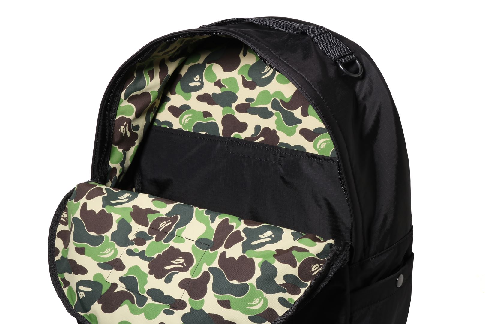 Double compartment daypack made of nylon ripstop material. A leather tag with the BUSYWORKS logo punched on the front panel, and a zipped pocket underneath the tag. A name tag embroidered with the names of the two brands is attached to the bottom left of the pocket. The ceiling zipper has a double zip design, zip pockets on both sides, an original carabiner on the top handle, and a strap on the back. Available in 2 colors and 1 size. Collaboration model with Porter.