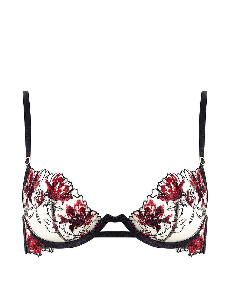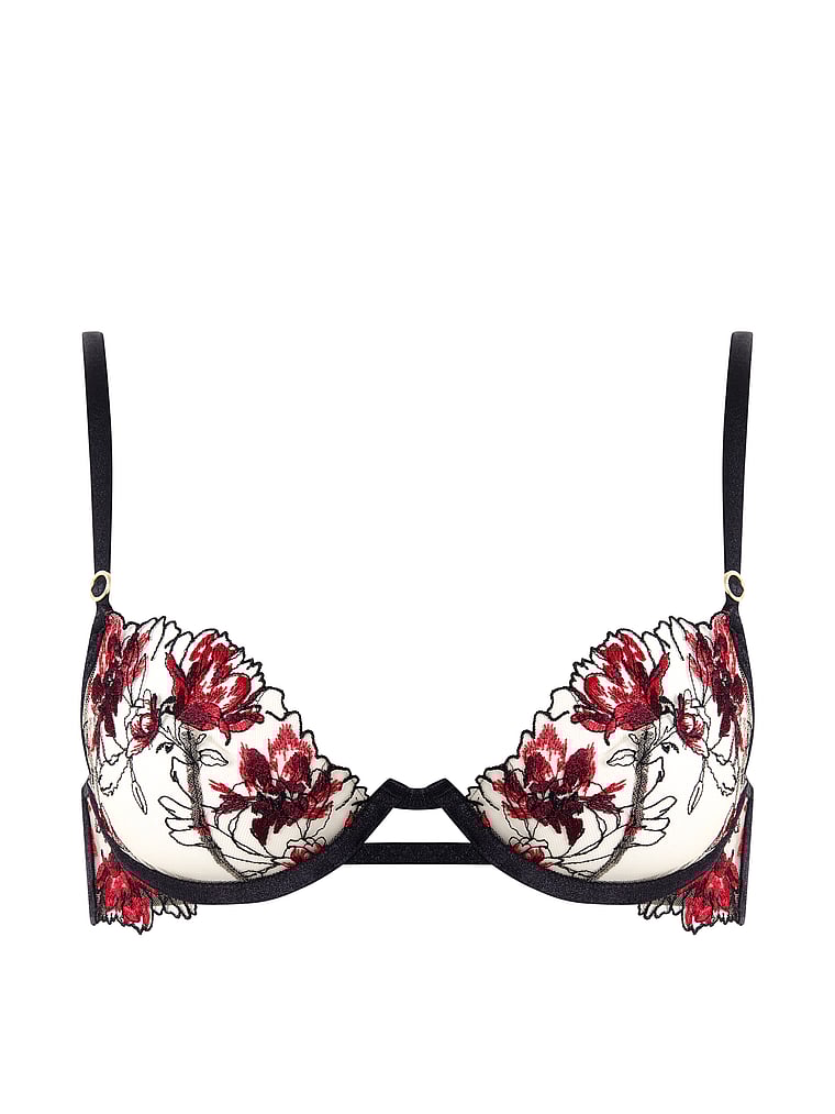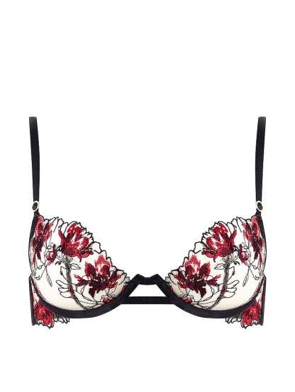 Delicate floral embroidery in shades of orange and red adorns this semi-sheer underwired bra, accentuated with gold-tone hardware. Pair it with the matching panty for a complete set.