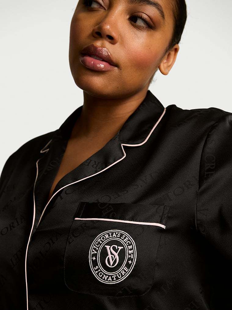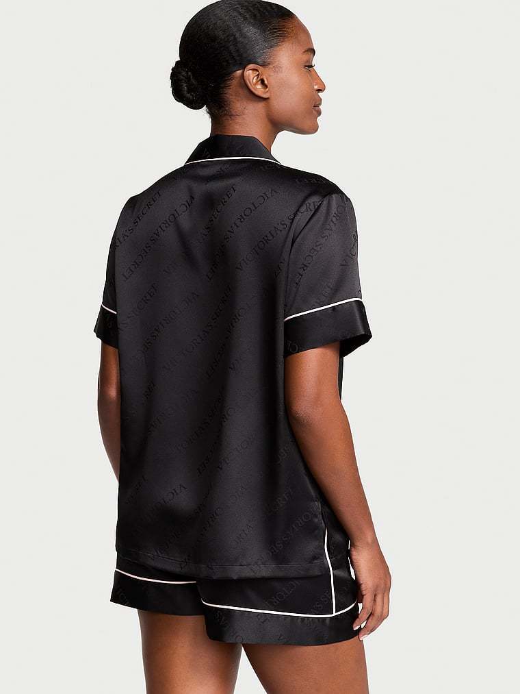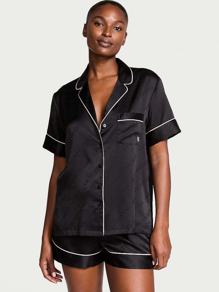 et your beauty sleep in our glossy set featuring a short-sleeve button-up and matching shorts. Finished with a chest pocket, notch collar, and decorative piping.